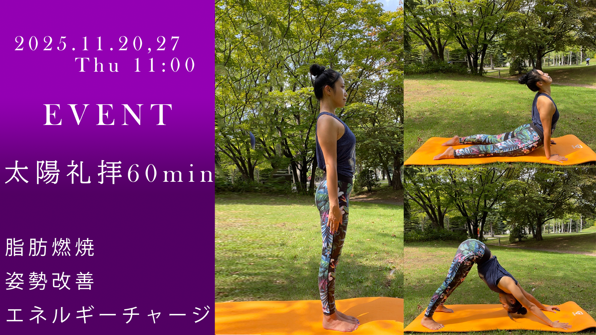 前半30分は肩こり解消や骨盤調整を目的とした強度低めのリフレッシュヨガ、後半は自然を感じながらぼーっとする感覚を楽しんで頂くリラックスヨガです!